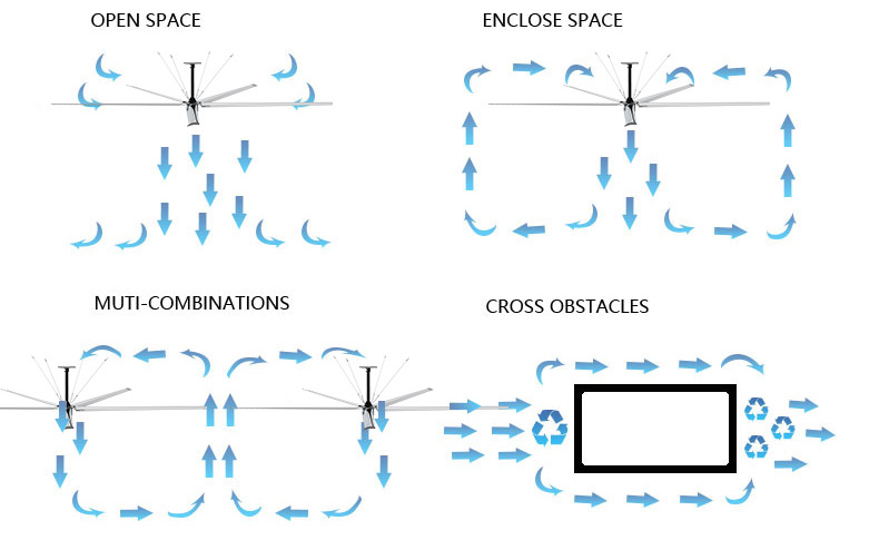 1. Wide coverage: Large diameter (7.3 meters), low speed, and orderly flow of air in a wide range, the effective approximate coverage area of each fan exceeds 1,500 square meters;