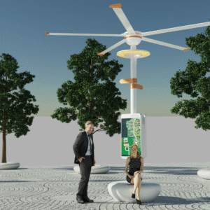 It is installed as a big umbrella, blade diameter up to 5.2m each with the effective coverage of 700SQM. It consumes only 0.66KW electricity per hour.